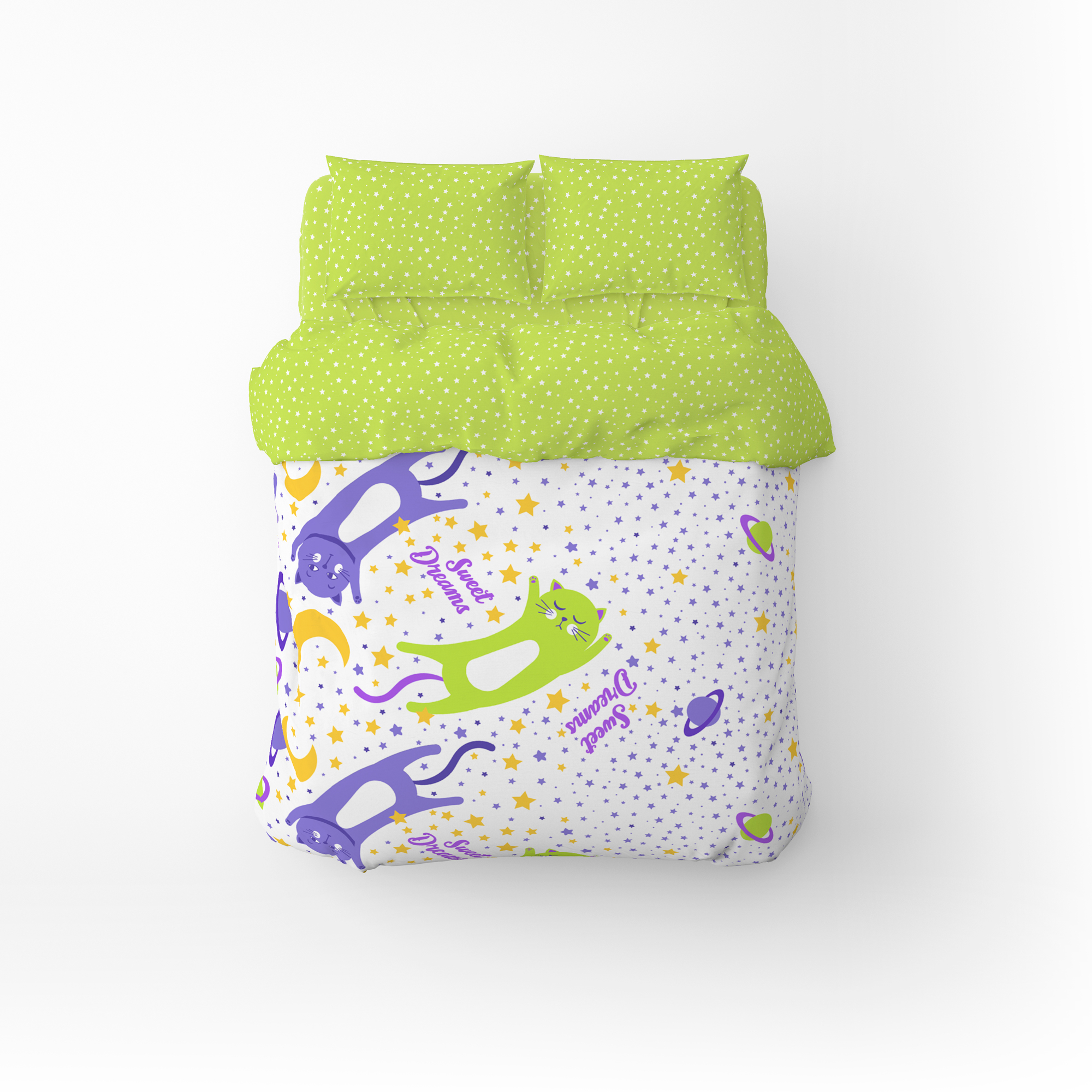 Півтораспальний комплект постільної білизни Home Line "Коти та зорі різні" (фіолетовий, лайм) 162242