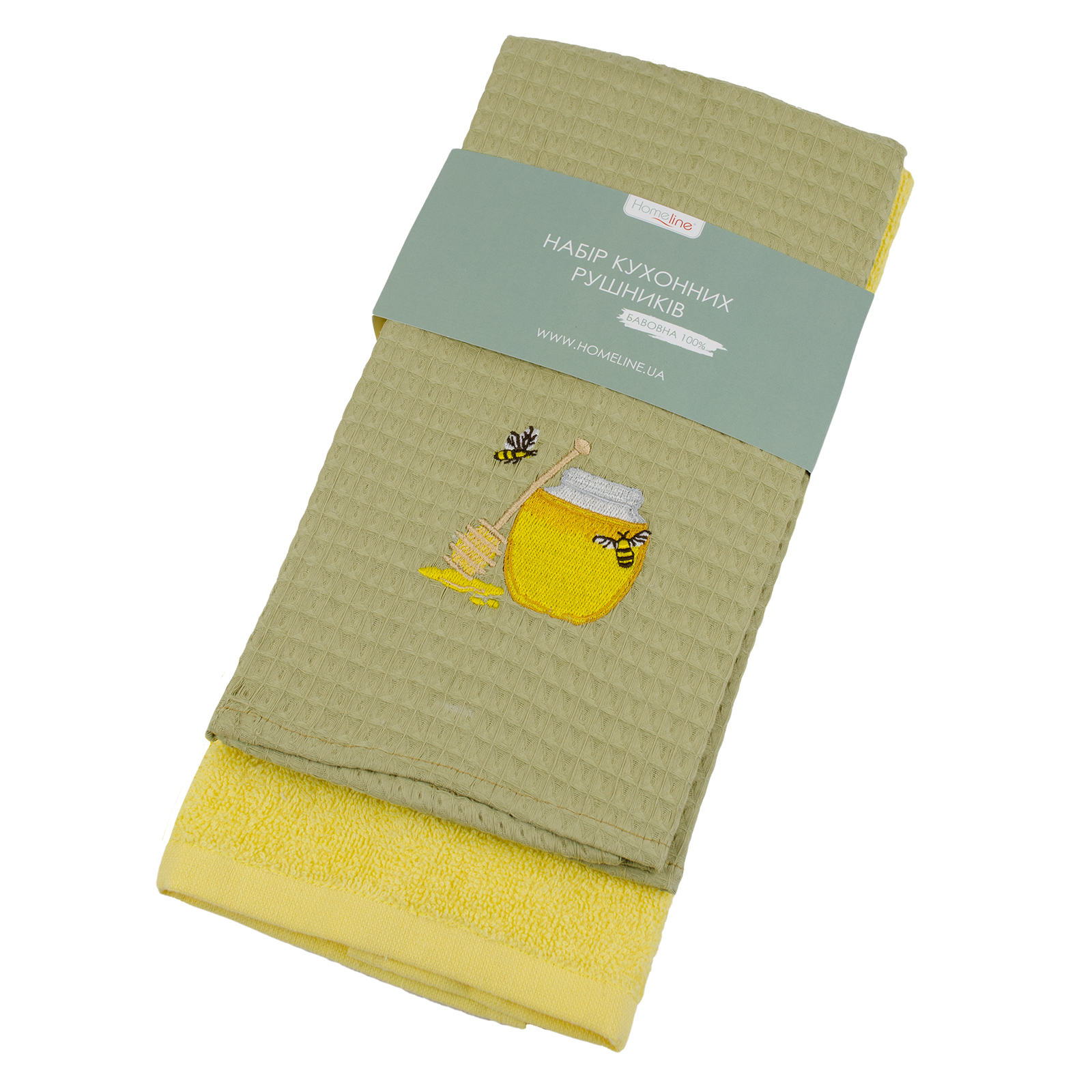 Набір кухонних рушників з гарним малюнком виготовлені з 100% бавовни. Вони порадують господиню не тільки оригінальним дизайном, але і відмінними експлуатаційними властивостями: добре поглинають вологу, м'які, легкі в догляді, довговічні. Набір з двох рушників Homeline (махрового 45х70 та вафельного 45х60 з вишивкою).