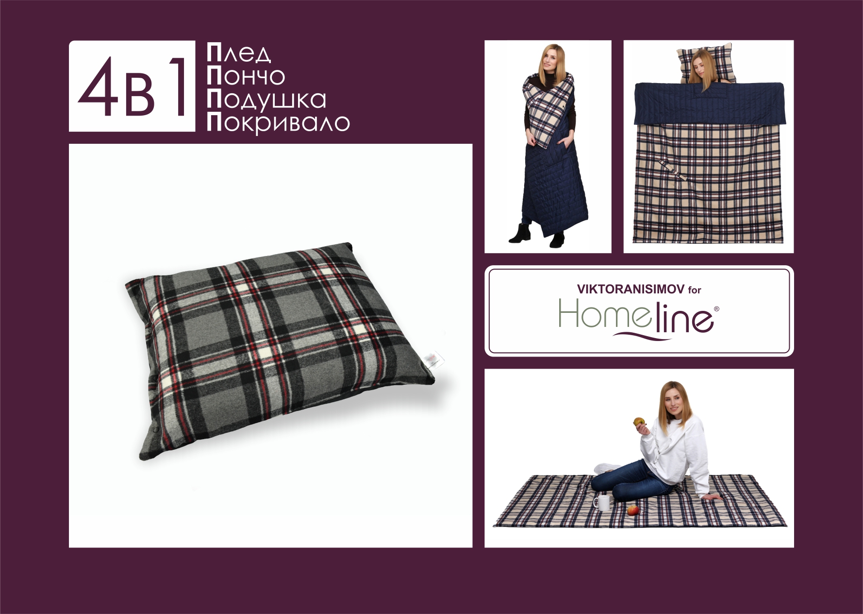 Плед-транформер 4 в 1 поєднує в собі: Подушку, Пончо, Плед, Покривало. Упакований 4П в спеціальний прозорий чохол з ручкою, щоб було зручно носити або дарувати. Верх виробу зробили з м'якої, приємної на дотик пальтової тканини з невеликим ворсом. Низ - з плащової водонепроникної тканини, яка простьобана з синтепоном для більшої м'якості і утримування тепла. Плед-трансформер - незамінна річ у подорожі, прогулянці або відпочинку на природі. Він компактний, практичний і дуже зручний у використанні. Плед-трансформер 4в1 стане прекрасним подарунком з будь-якого приводу.