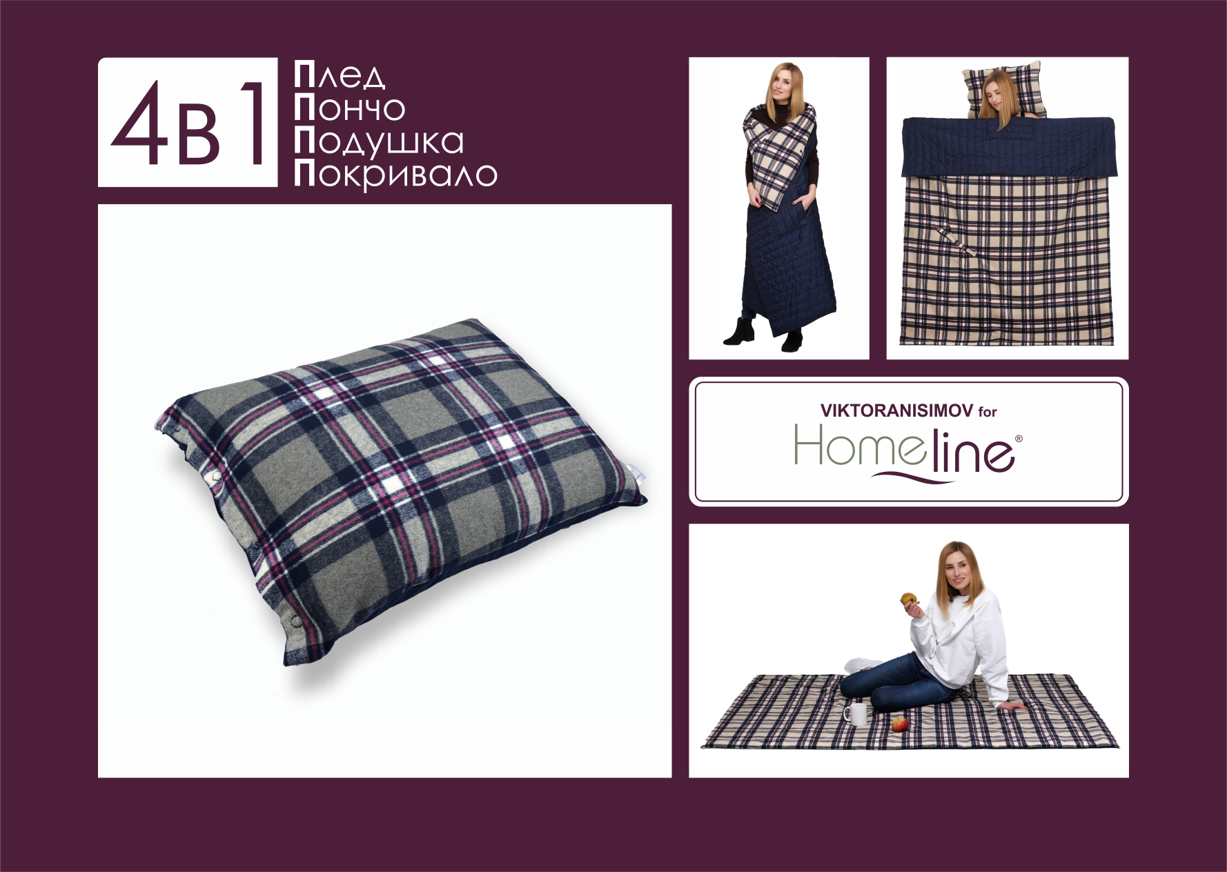 Плед-транформер 4 в 1 поєднує в собі: Подушку, Пончо, Плед, Покривало. Упакований 4П в спеціальний прозорий чохол з ручкою, щоб було зручно носити або дарувати. Верх виробу зробили з м'якої, приємної на дотик пальтової тканини з невеликим ворсом. Низ - з плащової водонепроникної тканини, яка простьобана з синтепоном для більшої м'якості і утримування тепла. Плед-трансформер - незамінна річ у подорожі, прогулянці або відпочинку на природі. Він компактний, практичний і дуже зручний у використанні. Плед-трансформер 4в1 стане прекрасним подарунком з будь-якого приводу.