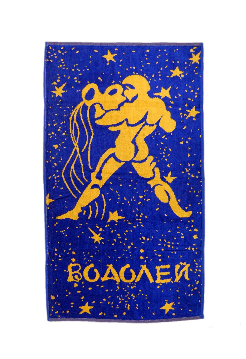 Велюровий рушник з жакардовим малюнком знаку зодіаку в синьо-жовтій кольоровій гаммі, м'якенький, миттєво поглинає вологу. Виготовляють з високоякісної бавовняної пряжі, що добре поглинає вологу. Щільність 420 г/кв.м. Виробник: Туреччина.