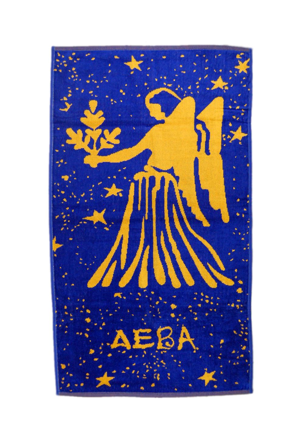 Велюровий рушник з жакардовим малюнком знаку зодіаку в синьо-жовтій кольоровій гаммі, м'якенький, миттєво поглинає вологу. Виготовляють з високоякісної бавовняної пряжі, що добре поглинає вологу. Щільність 420 г/кв.м. Виробник: Туреччина.
