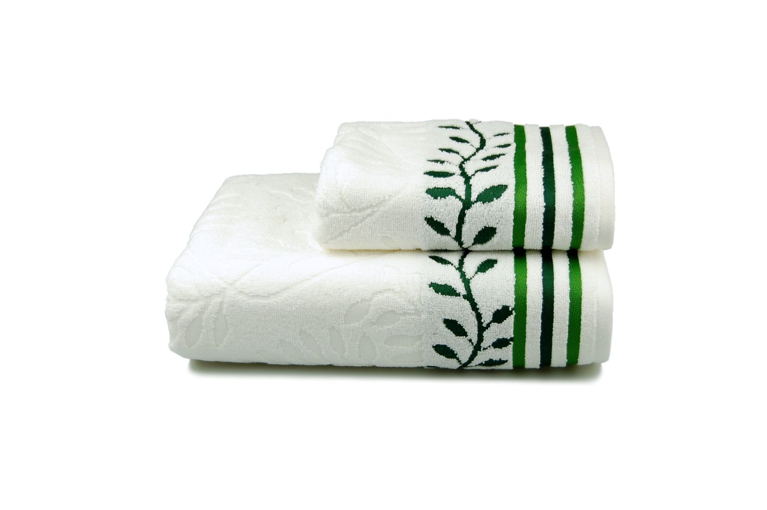 Махровий жакардовий рушник з рослинним малюнком та контрасним бордюром. Жакардове плетіння використовується для створення рельєфних малюнків, які дозволяють зберегти робочу поверхню рушника.