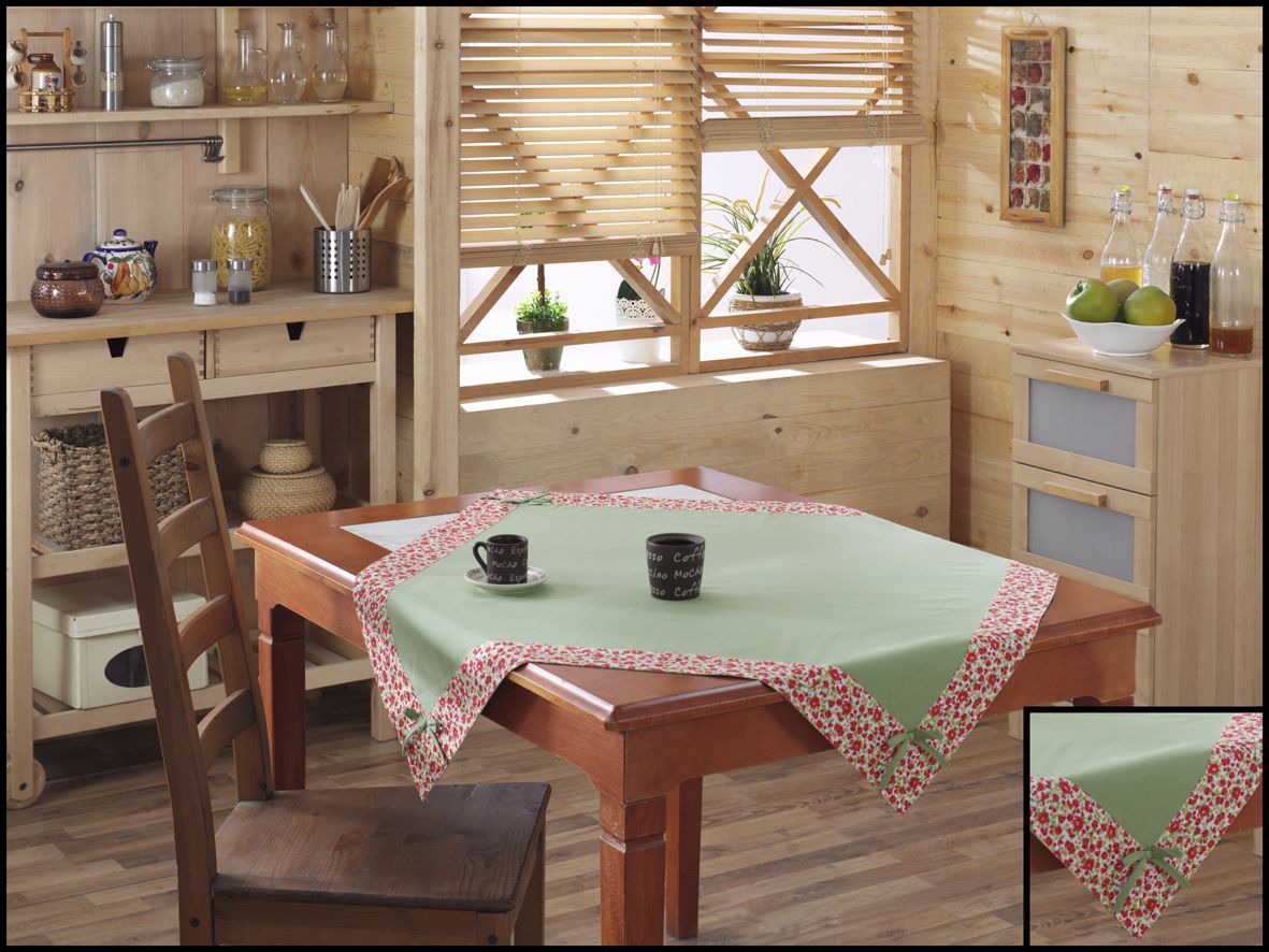 Cкатертина з однотонної бавовняної тканини зеленого кольору, обшита широким декоративним кантом. Розмір: 140x180 см. Склад: бавовна 100%. Виробництво: Туреччина.